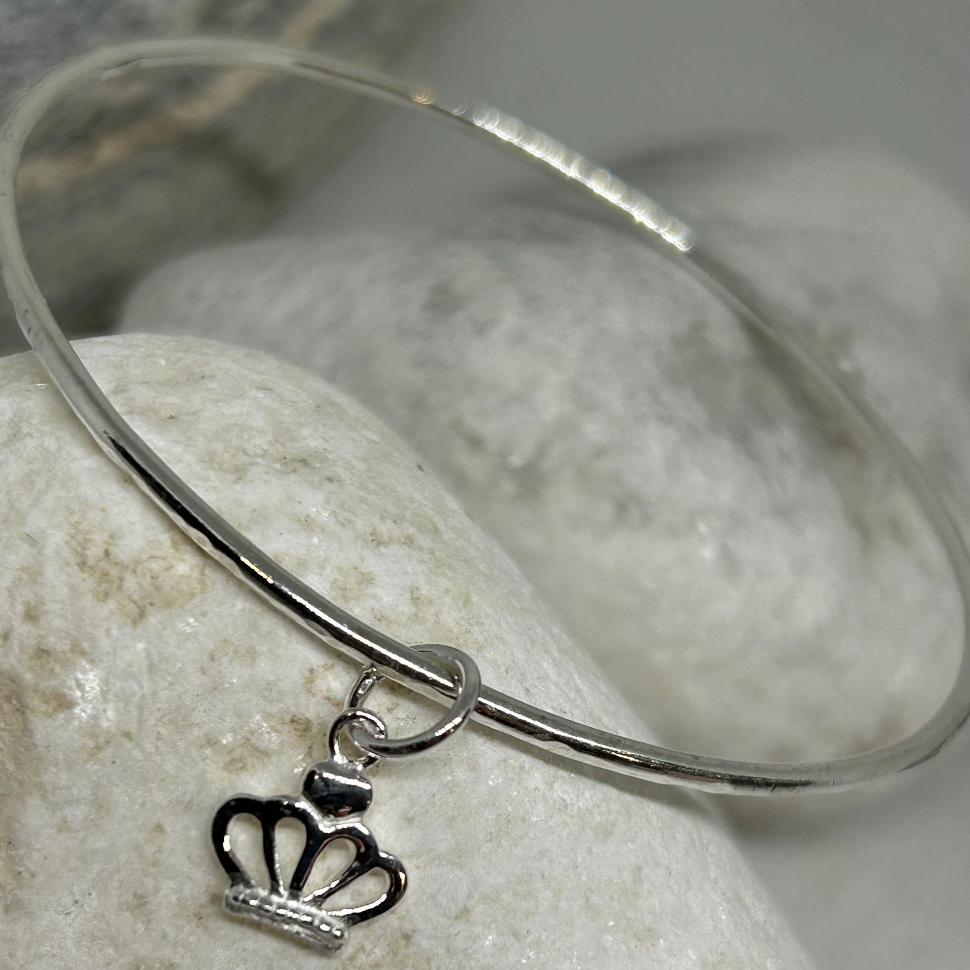 Sterling silver, hammered effect bangle with a beautiful princess crown for the princess in your life.